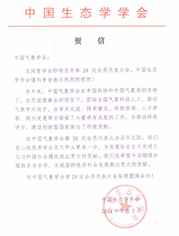 中国生态学学会贺信