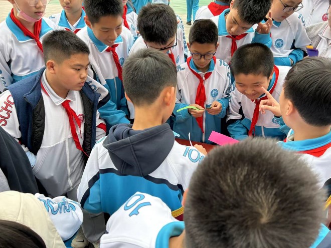 树蕙学堂前,同学们反复揣摩,认真思索谜底。初高中的孩子们一起享受着最传统的跨越年龄段的科学文化活动。对于沉浸在气象校园快乐成长的同学们,气候、气象及校园物候学的相关知识一点也不陌生。解出答案的同学们兴冲冲地冲向兑奖处,领取自己心仪的奖品。