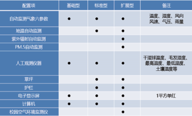 按照学校的场地大小和实际需要可以配备基础型、标准型、便捷型和扩展型校园气象站(如下图),其中标准型和扩展型气象站所使用的传感器可满足气象局业务要求。
