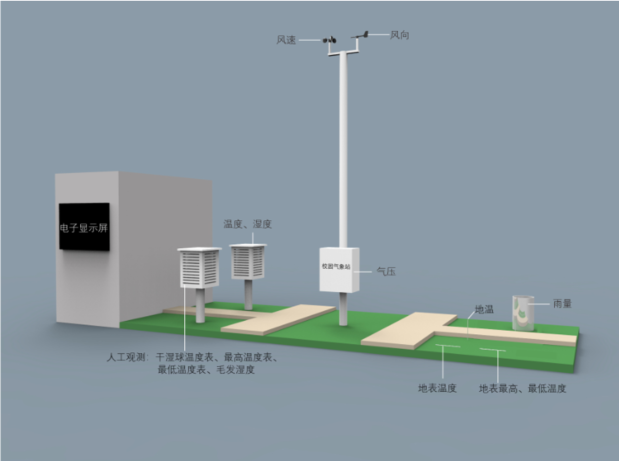 人工气象站:有气压计、电接风向风速计、最高温度表、最高温度表、干湿球温度表、雨量器、地面最高温度表、地面最低温度表、浅层曲管地温表。